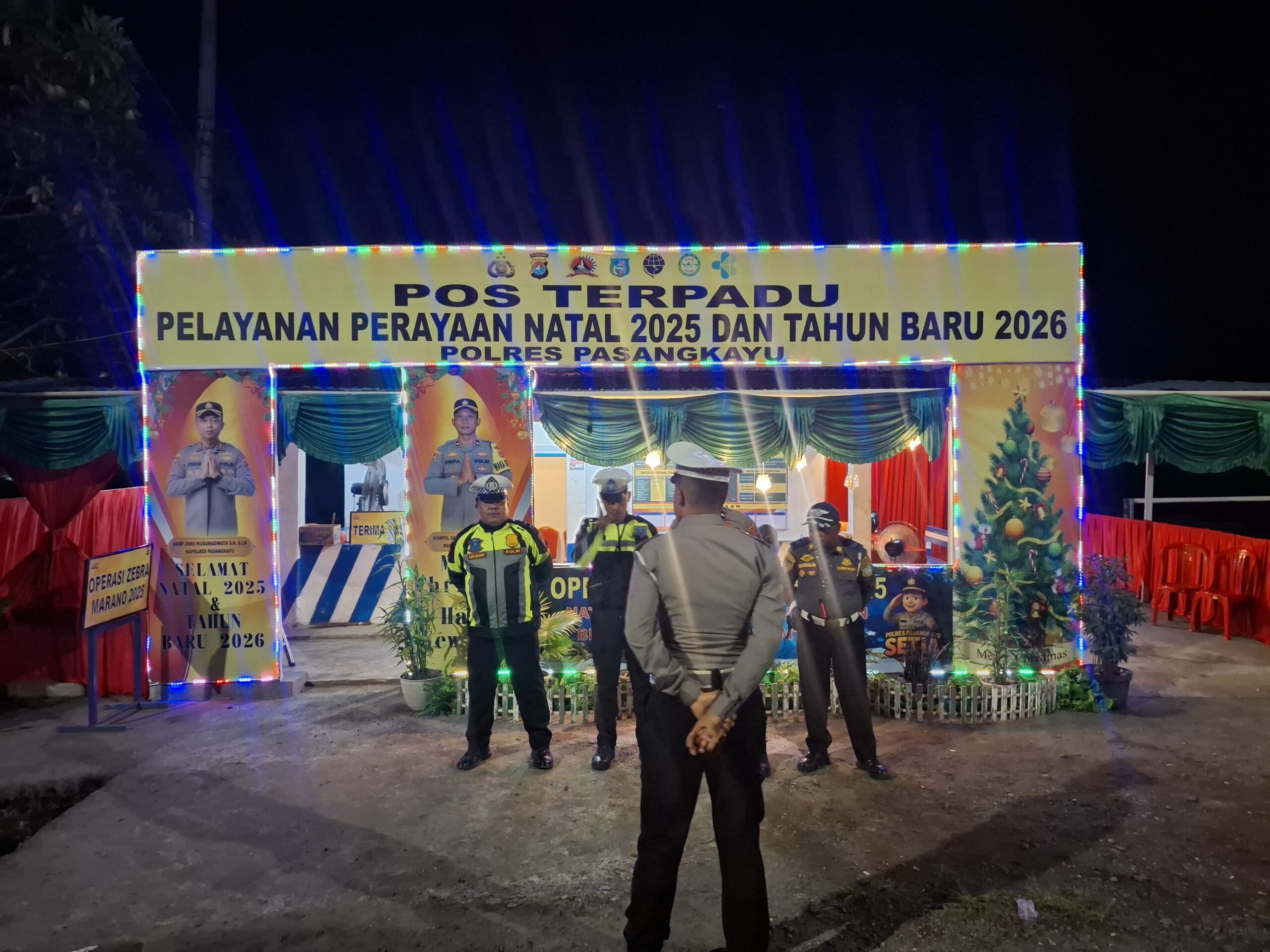 Kapolres Pasangkayu AKBP Joko Kusumadinata, S.H., S.I.K., melalui Ka Pos Pam Terpadu Bundaran Smart IPTU Wahyu Dwi Mangundiharjo, S.Tr.K., menyampaikan bahwa kehadiran personel Polri di tengah masyarakat diharapkan mampu memberikan rasa aman, nyaman, serta menciptakan situasi yang kondusif selama perayaan Natal dan Tahun Baru di Kabupaten Pasangkayu.