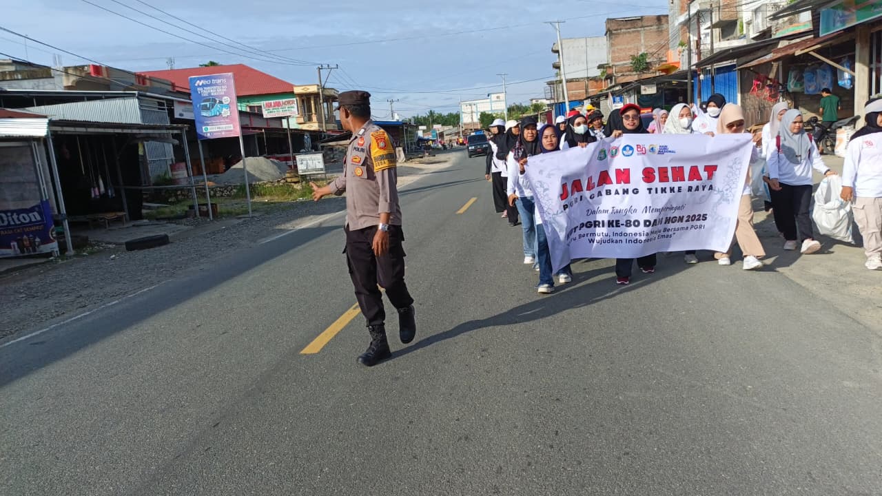 Polres Pasangkayu – Dalam rangka memperingati Hari Guru Nasional, Bhabinkamtibmas Polsek Pasangkayu BRIPKA Ardianto melaksanakan pengamanan, pengawalan, dan pemantauan kegiatan senam serta jalan santai yang diselenggarakan oleh PGRI Kecamatan Tikke Raya pada Minggu, 23 November 2025, pukul 06.00 Wita. Kegiatan dipusatkan di Lapangan Sepak Bola Dusun Mekar, Desa Tikke, Kecamatan Tikke Raya, Kabupaten Pasangkayu.