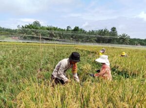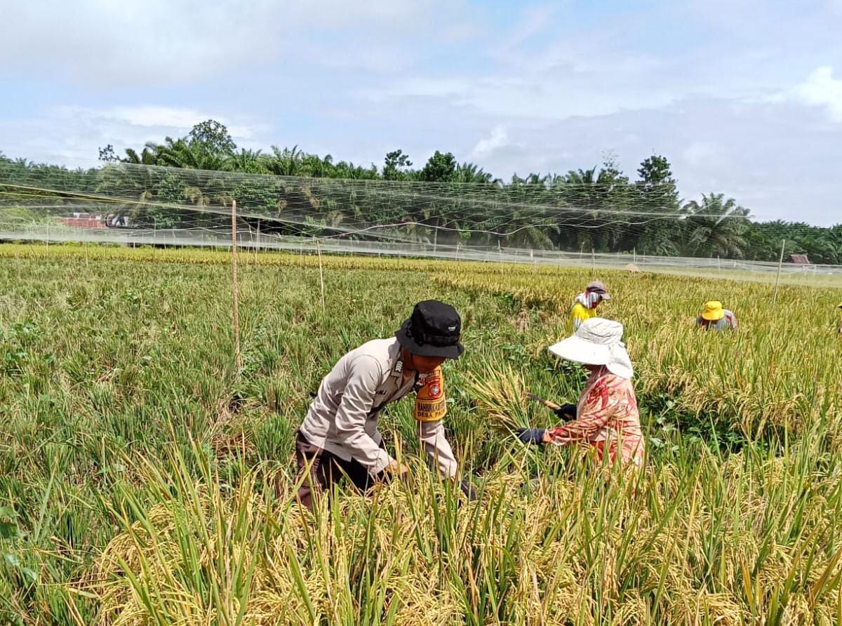 POLRES PASANGKAYU – Bhabinkamtibmas Polsek Sarudu Polres Pasangkayu Polda Sulbar Bripka Irwan melaksanakan sambang ke warga binaanya yang sedang panen padi di sawah Dusun Polewali Desa Patika Kecamatan Sarudu Kabupaten Pasangkayu, Kamis (24/04/2025)