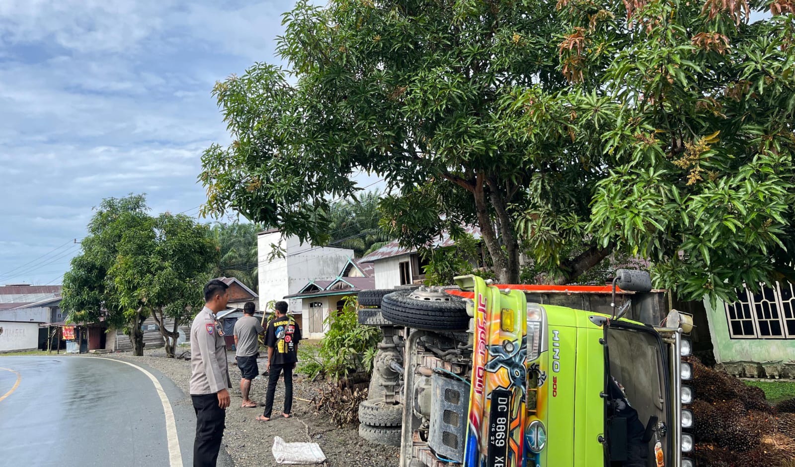 Polres Pasangkayu – Polsek Baras Polres Pasangkayu bergerak cepat mendatangi Tempat Kejadian Perkara (TKP) peristiwa kecelakaan lalu lintas tunggal yang terjadi di wilayah hukumnya. Kecelakaan tersebut melibatkan satu unit kendaraan roda empat jenis mobil Dump Truck Hino Dutro 130 HD warna hijau dengan Nomor Polisi DC 8869 XB.