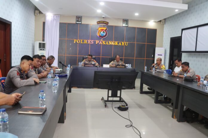 Polres Pasangkayu – Polres Pasangkayu melaksanakan kegiatan Analisa dan Evaluasi (Anev) Mingguan yang dipimpin langsung oleh Kapolres Pasangkayu AKBP Joko Kusumadinata, S.H., S.I.K, didampingi Wakapolres Pasangkayu Kompol Agussalim Arsyad, S.Ag., M.H. Kegiatan tersebut diikuti oleh para Pejabat Utama (PJU) Polres Pasangkayu.