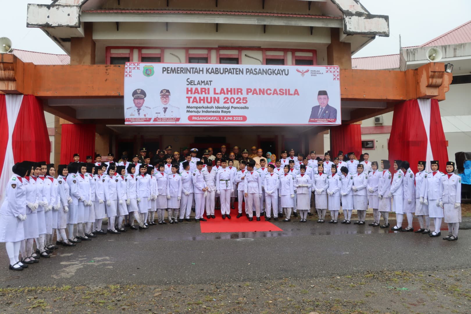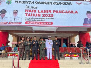 POLRES PASANGKAYU – Mewakili Kepala Kepolisian Resor Pasangkayu AKBP Joko Kusumadinata S.H, S.I.K, Pejabat Utama Polres Pasangkayu AKP Manayur S S.Pdi berserta Kapolsek Pasangkayu AKP Mustmir S.H, M.H dan Kapolsek Bambalamotu IPTU Yauri Yusuf S.H, mengikuti upacara peringatan hari lahir Pancasila bertempat di Halaman Kantor Bupati kabupaten Pasangkayu, Minggu (01/06/2025). Turut hadir dalam pelaksanaan Sekda Kabupaten Pasangkayu Muh.Zain Machmud S.Sos Kepala Kemenag Kab.Pasangkayu H.Muhammad Hatta S.Ag, Pasiter Dandim 1427/Pasangkayu,Kapten Inf Ismail, Danramil 1427-03/Baras,Lettu Czi M Yusuf, Yang mewakili Kajari Kab.Pasangkayu Fadil, Anggota DPRD Kab.Pasangkayu Farid Zuniawansyah S.Sos, Segenap OPD Pemerintahan Kab.Pasangkayu, Segenap perwakilan Organisasi Darmawanita Kab.Pasangkayu