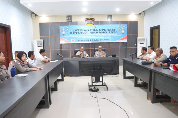 Polres Pasangkayu – Polres Pasangkayu menggelar Latihan Pra Operasi Ketupat Marano 2026 sebagai bentuk kesiapan personel dalam menghadapi pengamanan Hari Raya Idul Fitri 1447 H / 2026 M. Kegiatan tersebut dilaksanakan pada Rabu, 11 Maret 2026 pukul 09.00 WITA bertempat di Aula Rupatama Polres Pasangkayu.