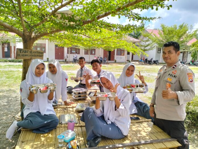 Polres Pasangkayu – Polsek Sarudu terus menunjukkan komitmennya dalam mendukung program peningkatan gizi bagi pelajar dengan melakukan pemantauan kegiatan pemberian makan bergizi yang dilaksanakan oleh SPPG Yayasan Insan Sehat Lestari, Kecamatan Duripoku–Pasangkayu.