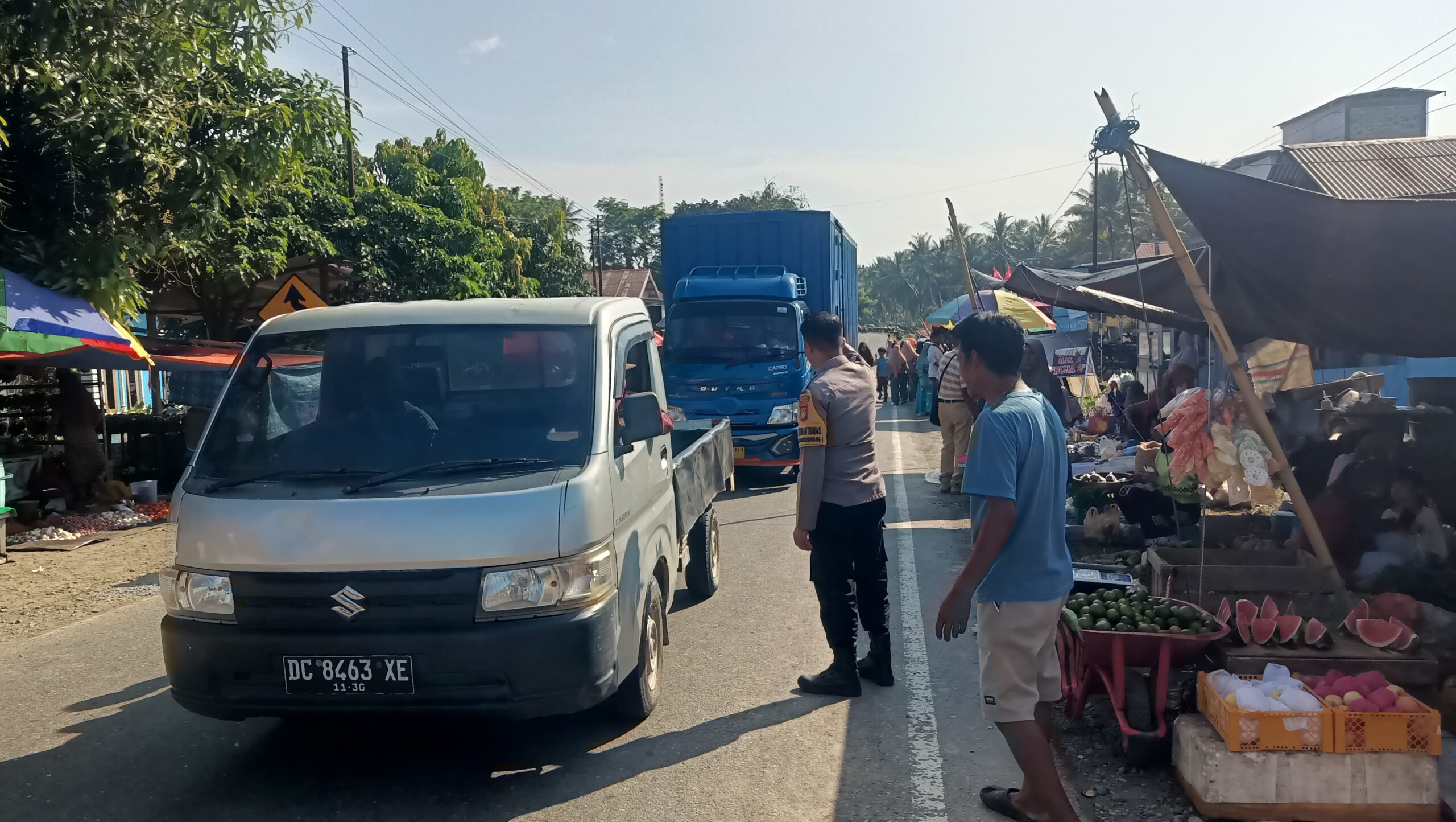 Tidak hanya itu, petugas juga melaksanakan pengaturan arus lalu lintas di jalan trans yang berada tepat di depan pasar. Hal ini dilakukan untuk mengurai kepadatan kendaraan yang kerap terjadi saat aktivitas jual beli berlangsung, sekaligus mencegah terjadinya kemacetan dan kecelakaan lalu lintas.
