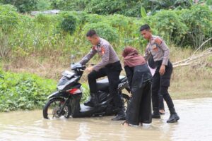 Genangan air yang cukup tinggi akibat banjir menyebabkan beberapa pengendara kesulitan melintas, bahkan kendaraan mereka nyaris mogok di tengah jalan. Melihat kondisi tersebut, personel Polres Pasangkayu yang sedang melaksanakan patroli langsung turun ke lokasi untuk memberikan bantuan dengan menuntun dan mendorong kendaraan agar dapat melewati genangan air dengan aman.